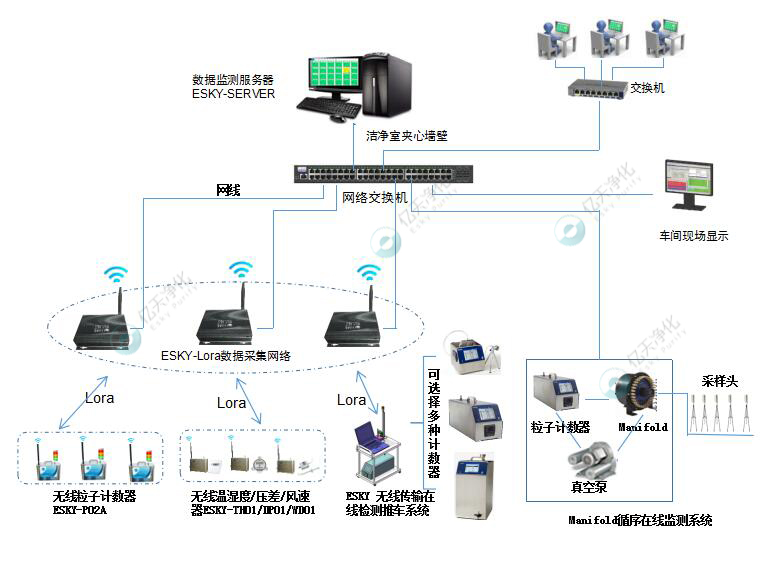 ESKY環(huán)境粒子無線實時監(jiān)測+無線推車檢測系統(tǒng)+有線循序監(jiān)測集成系統(tǒng),綜合了無線監(jiān)測系統(tǒng)安裝方便、降低施工難度、節(jié)約施工時間的優(yōu)點和無線推車系統(tǒng)靈活性強的優(yōu)點,以及有線循序監(jiān)測較為經(jīng)濟的優(yōu)點。打造全方位一體式的監(jiān)測功能,實用性強、綜合性強、便于高效管理。適用于電子、半導體、電池等行業(yè)大型潔凈室。