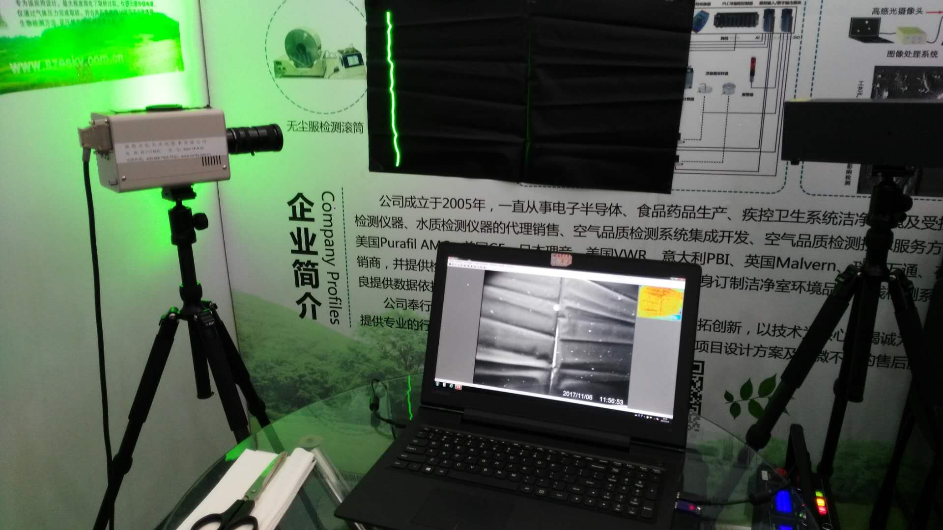 本次展會上,我司還專門展示了一套先進(jìn)的“微粒子可視化系統(tǒng)”,此系統(tǒng)可以把我們通常潔凈室測試時(shí)的微小粒子(0.3微米、0.5微米等等)通過特殊的設(shè)備將粒子的大小和運(yùn)動(dòng)軌跡通過視頻的方式展現(xiàn)出來,把大家平常測試看不到的東西可視化、直觀化,有利于企業(yè)尋找粒子問題的來源、降低環(huán)境及產(chǎn)品中顆粒物。