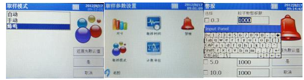 3、取樣時間設(shè)置:“設(shè)置”頁面選擇“取樣時間”,其中可以通過軟鍵盤修改取樣個數(shù)、取樣延時時間、取樣間隔時間、每次取樣時間或每次取樣體積,設(shè)置完畢后選擇“是”。