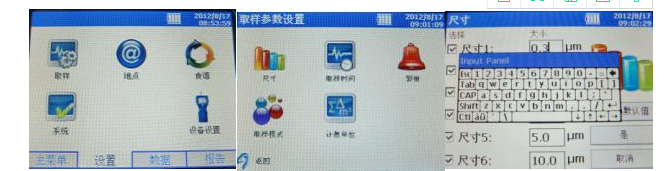 2、檢測尺寸設(shè)置:返回“設(shè)置”頁面,選擇“取樣”,選擇“尺寸”修改需要檢測的粒子尺寸,最多可同時檢測六種尺寸,每個尺寸可以在“大小”的方框中通過軟鍵盤修改,范圍需在0.3-10μm之間。設(shè)置完畢后點(diǎn)擊“是”。