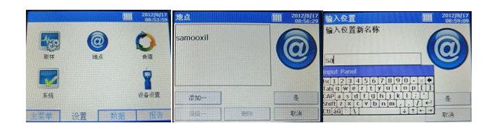 1、地點(diǎn)設(shè)置(用來標(biāo)記目前監(jiān)測地點(diǎn)):主屏幕下方“設(shè)置”——> “地點(diǎn)”——> “添加...”,進(jìn)入后點(diǎn)擊條形框出現(xiàn)虛擬鍵盤進(jìn)行地點(diǎn)編輯(不支持中文輸入),編輯完畢后點(diǎn)擊回車鍵,點(diǎn)擊“是”,地點(diǎn)編輯完畢。